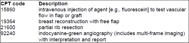Partial rib resection (21600) is bundled within the 19364 code. 92240 is the code used for indocyanine green in retinal surgery, so is inappropriate. 15860 is the most appropriate code for assessing flap perfusion with indocyanine green. This code can be reported separately from the free flap code.