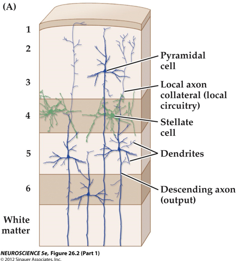 Pyramidal cells are the main excitatory neuronal types found in the deep and superficial layers of the cortex. Their dendrites and axons make specific projections across or within the cortical layers.