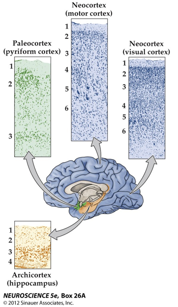 The evolutionary-older brain regions, like the paleocortex and archicortex (hippocampus), have 3 and 4 layers respectively.