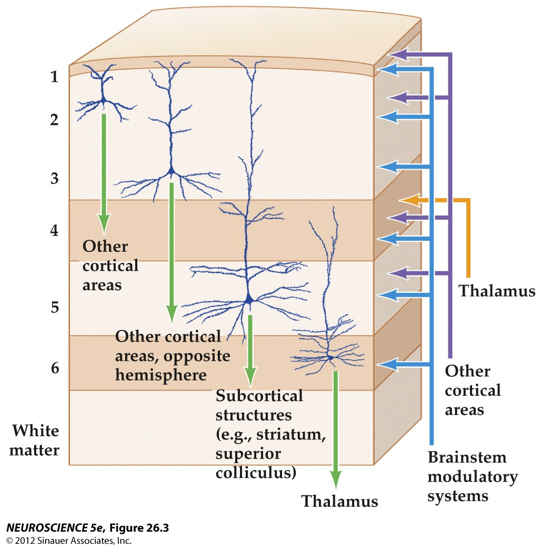 Describe for the thalamus, brainstem and other cortical inputs where in one of the 6 cortical layers they project to.