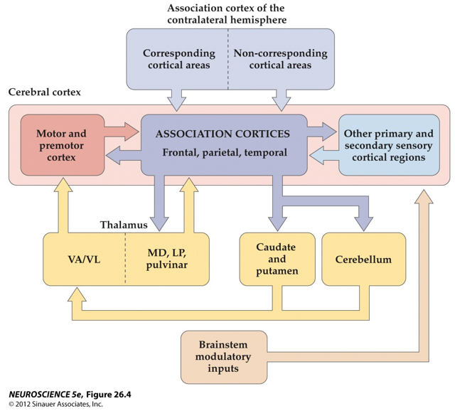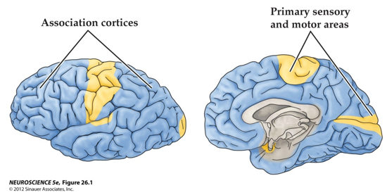 The primary sensory and motor cortices make up a fraction of the human cortex and ‘only’ receive sensory information via thalamic nuclei. The association cortices make up a much larger part of the human cortex.
