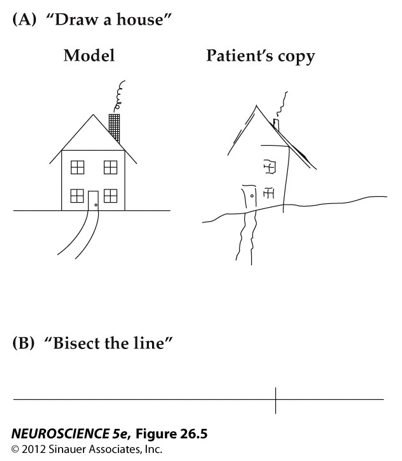 In the lecture, a video is shown where the patient draws daisies. But since she has visual neglect (and damage on the left side of the parietal cortex), she is only able to draw the right part of the daisy (and doesn’t even recognize that she only drew half of the daisy).