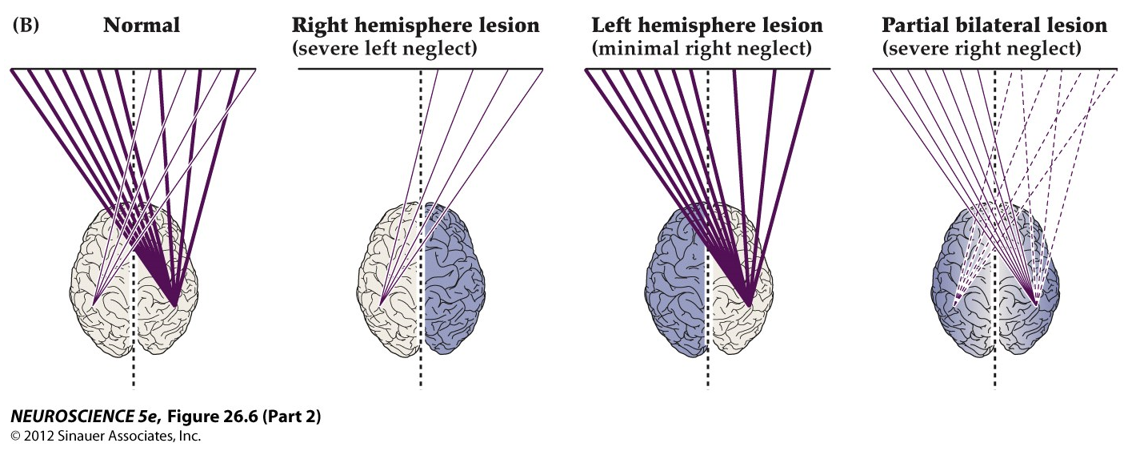 This is because the left parietal cortex mediates attention primarily to the right and also seems to be much more involved in language processing, whereas the right parietal cortex mediates attention to both left and right halves of the body and extrapersonal space.