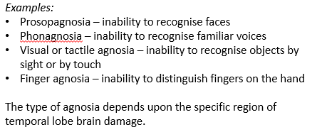 Agnosias → problems with recognition and identification of objects in the environment. (Examples of agnosias are depicted in the picture)