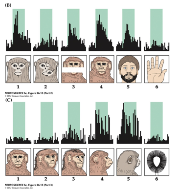 This picture provides evidence for the role of the temporal lobe during face recognition. You see that when a face is clearly depicted, certain neurons fire, while if the face is distorted (like in picture 2 or 3) the activity of temporal lobe neurons decreases.