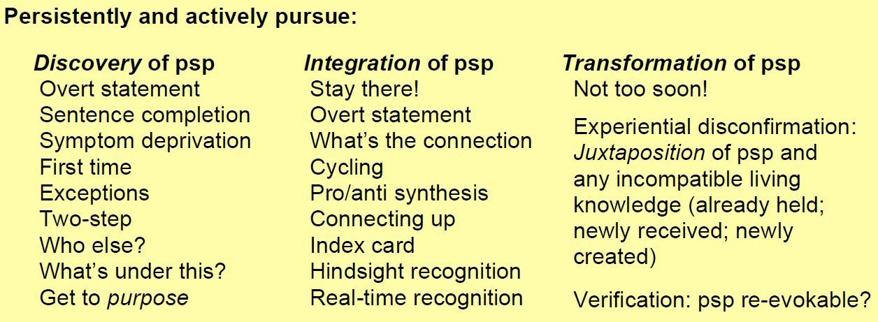Very specifically name the disconfirmed and disconfirming knowings, in order to recue them. The client re-encounters the juxtaposition afresh.