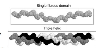 1) After secretion, collagen is further modified by removal of the globular cysteine-rich Nand C- terminal domains. This modification decreases the solubility 1000-fold, causing the collagen units to form spontaneously into fibrils.