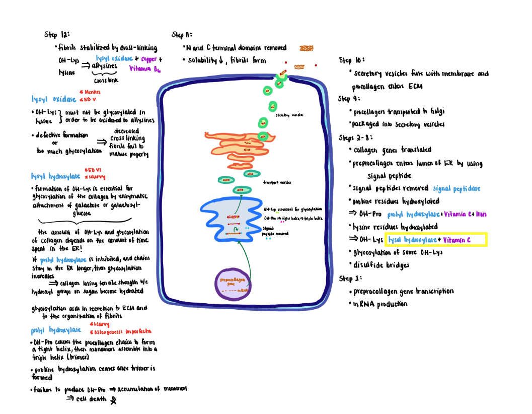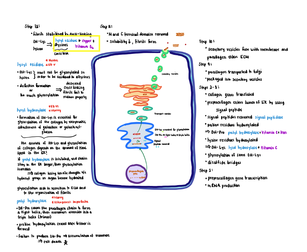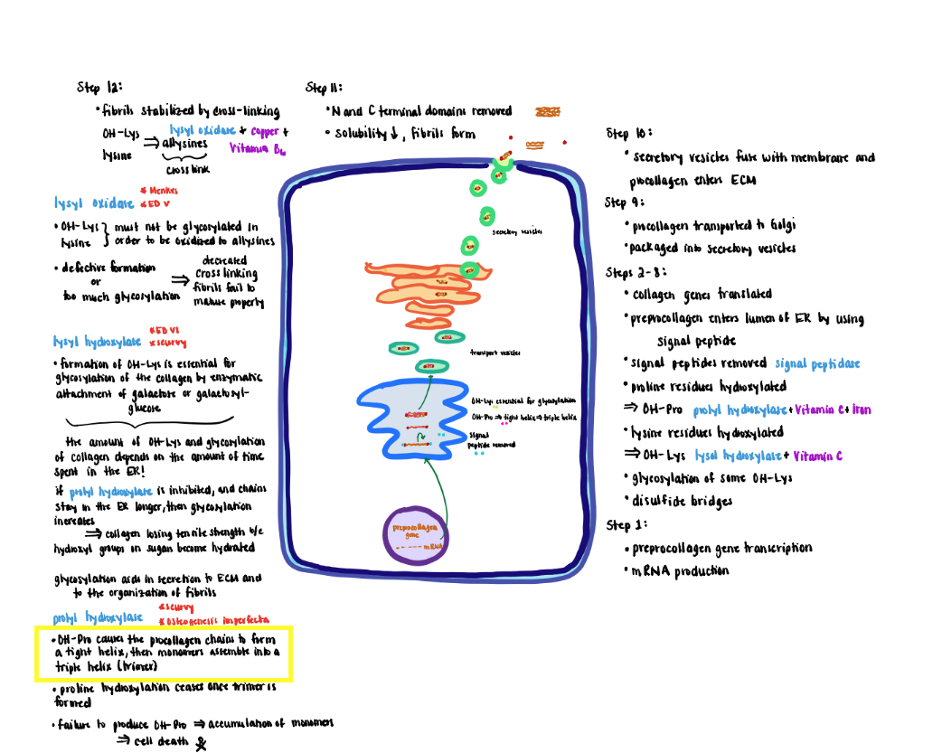 1) Collagen genes transcribed in the nucleus produce mRNA, which is translated by ribosomes on the rough endoplasmic reticulum (ER).