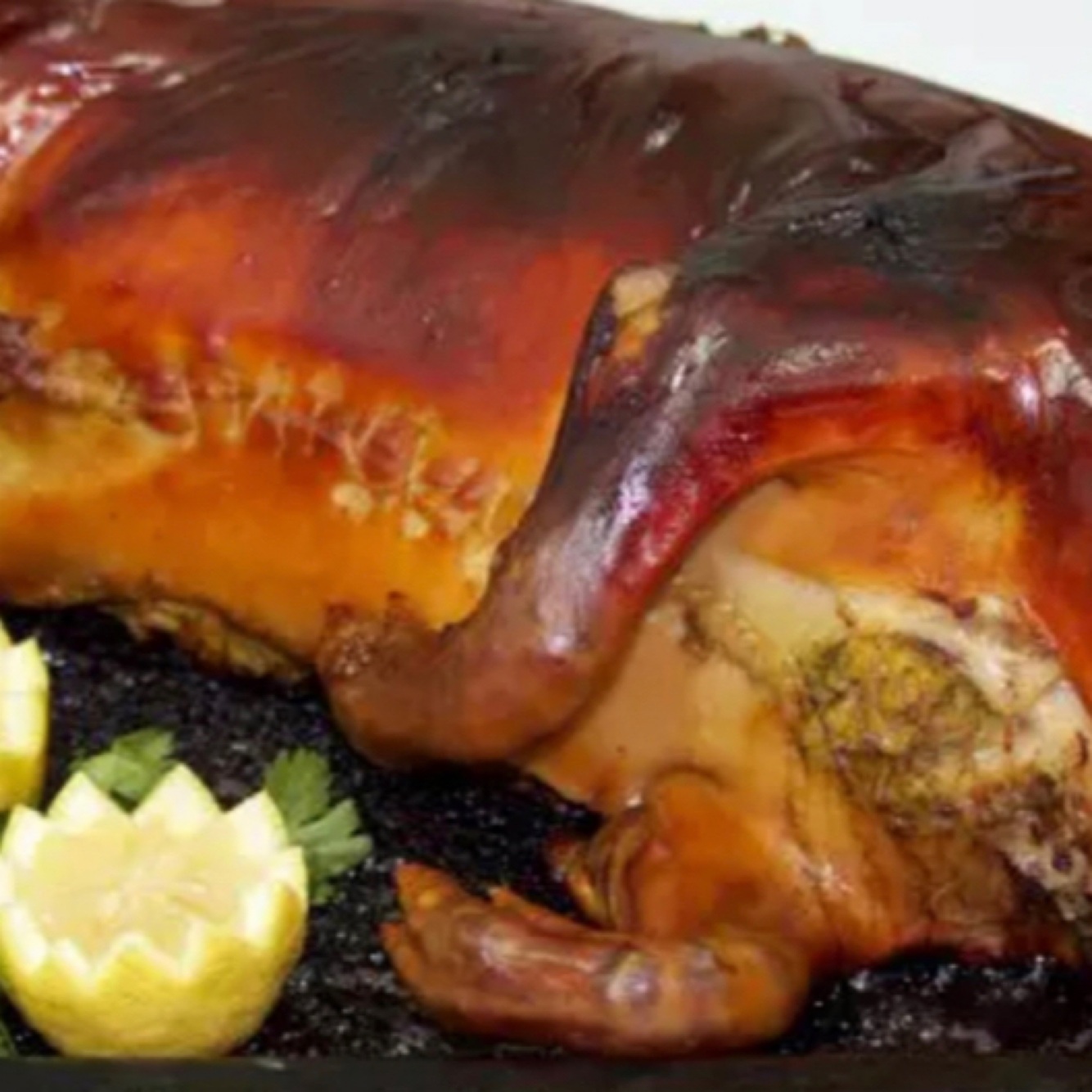 Slow roasted piglet, usually sold from a stand at the side of the road.