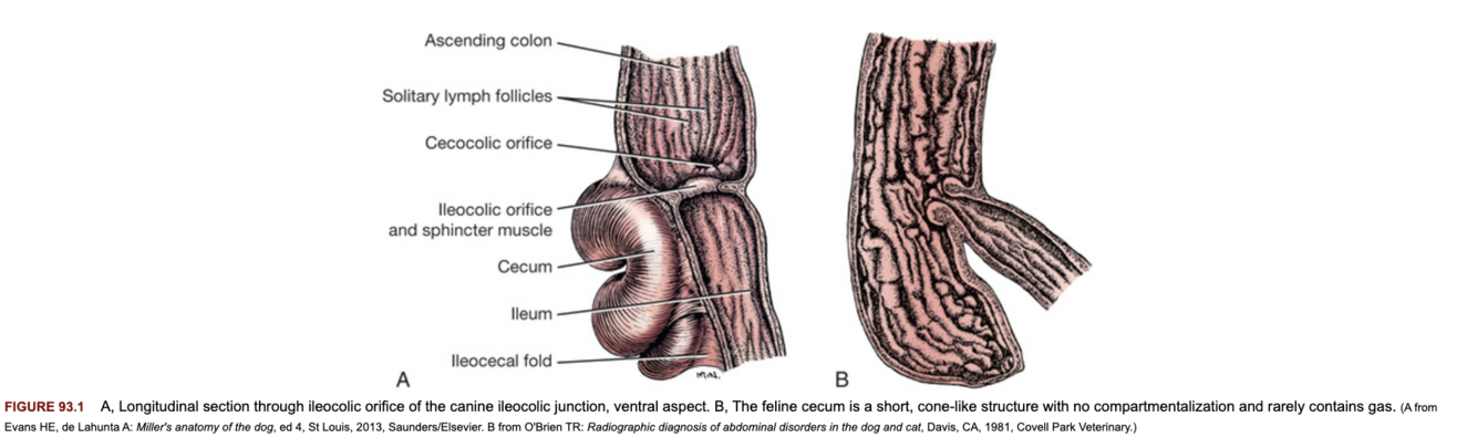 Cats: adjacent to the ileocolic orifice.