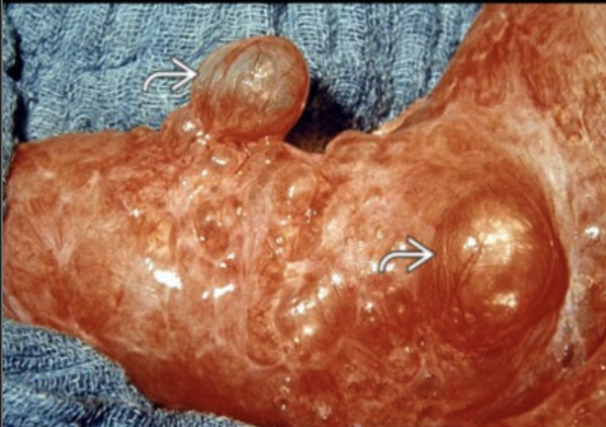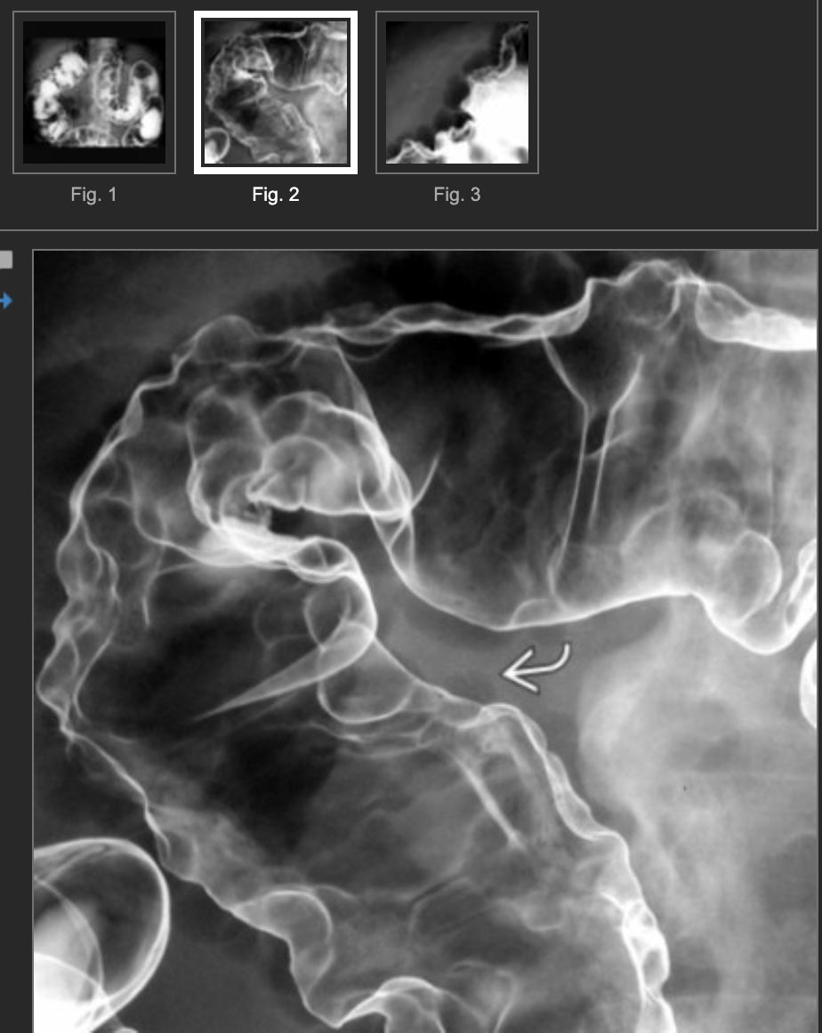 Dx? 50yo male pt w/vague abdo pain & distention & no recent Hx of instrumentation.