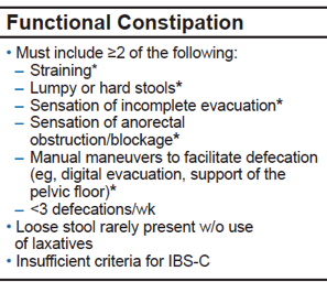 Infrequent (less than 3/week) BM for 12 months with straining/feeling of incomplete evacuation/hard stool at least 25% of the time