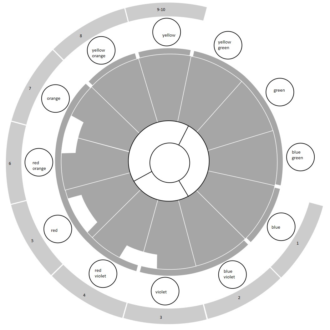 Label the color wheel with levels and dominant pigment.