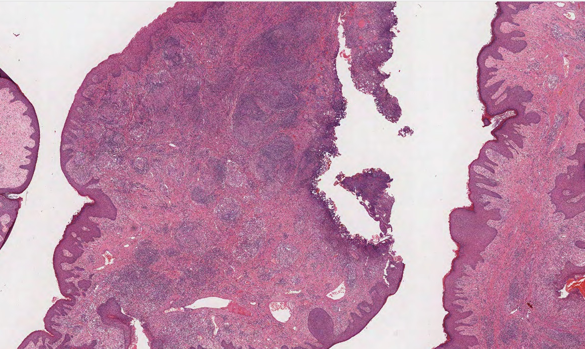 The section reveals acanthosis and hyperkeratosis affecting the squamous epithelium, but there is also focal ulceration as well as prominent inflammation within the subepithelial tissues. The inflammatory process includes numerous non-caseating epithelioid granulomas together with a predominantly lymphocytic inflammatory infiltrate elsewhere, with the formation of lymphoid aggregates. In some areas there are also sheets of histiocytes intermingled with the lymphocytes, without obvious circumscribed granuloma formation. Areas of collagenous fibrosis are also evident within the subepithelial zone. The appearances conform to those of chronic and active granulomatous inflammation with focal ulceration of the squamous epithelium, highly characteristic of Crohn’s disease with anal/perianal involvement.