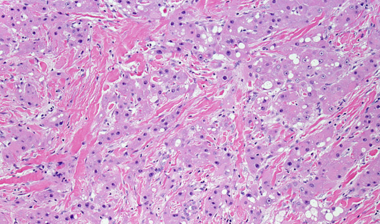 Trabecula, sheets or cords of neoplastic cells with abundant oncocytic cytoplasm cells in background of dense collagen bundles frequently arranged in parallel lamellae