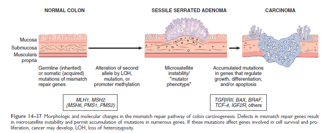 • The defects occur in the setting of microsatellite instability. ( Microsatellite instability (MSI) is the condition of genetic hypermutability that results from impaired DNA mismatch repair (MMR). The presence of MSI represents phenotypic evidence that MMR is not functioning normally.)