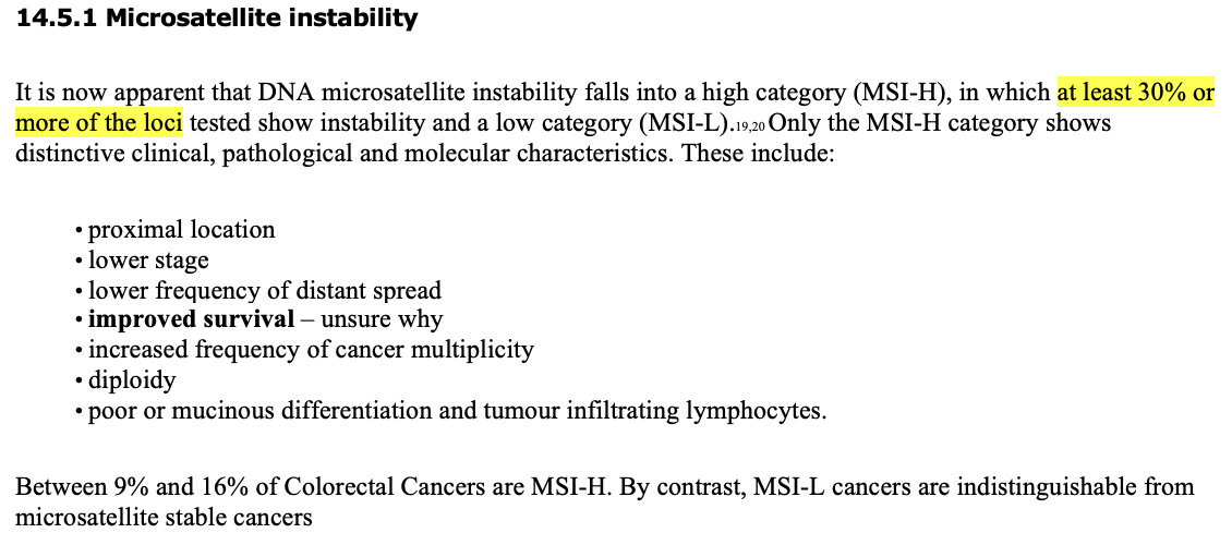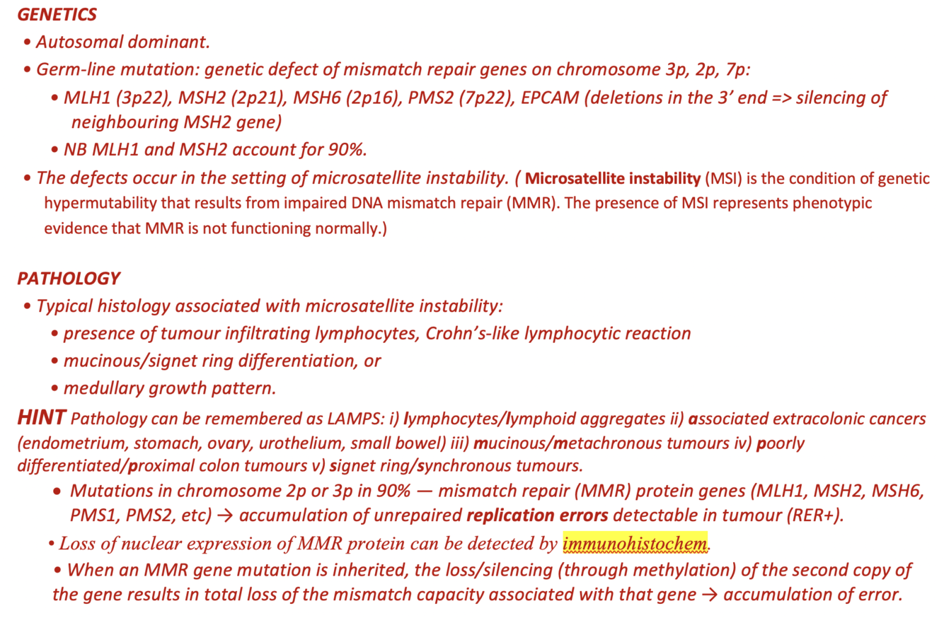 Characterised by the presence of microsatellite instability (biological “footprint” of defect in MMR as there is accumulation of abnormalities in short sequences of nucleotide bases that are repeated dozens to hundreds of times within the genome)
