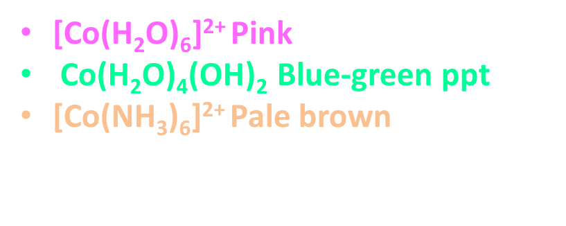 With OH- or NH3: blue-green ppt Co(H2O)4(OH)2