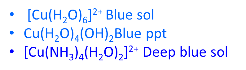 With OH- or NH3: Blue ppt Cu(H2O)4(OH)2