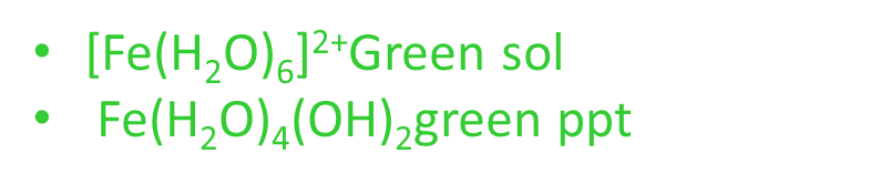With OH- or NH3: green ppt Fe(H2O)4(OH)2