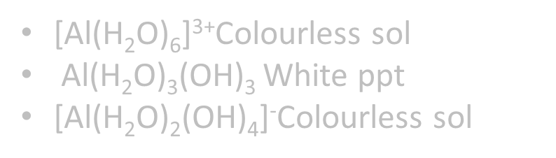 Excess OH-: colourless sol [Al(H2O)2(OH)4]-