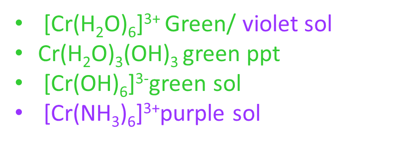 With OH- or NH3: green ppt Cr(H2O)3(OH)3
