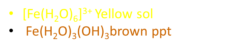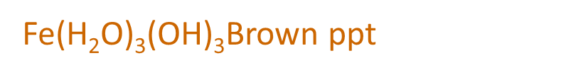 With OH- or NH3: brown ppt Fe(H2O)3(OH)3