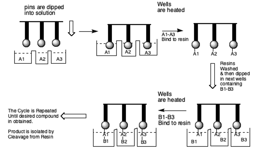 It is then resin washed and dipped into the next set of wells, containing a new set of different compounds.