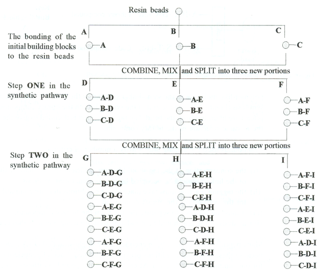 Where the chemistry is done in the solid phase, usually taking the form of a resin bead that compounds bind to.