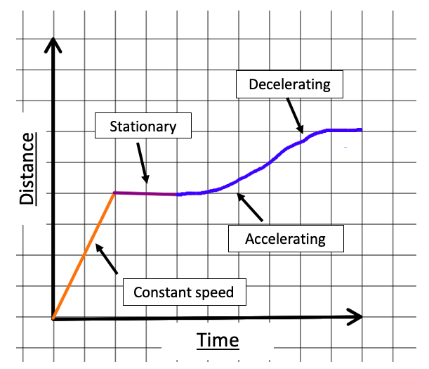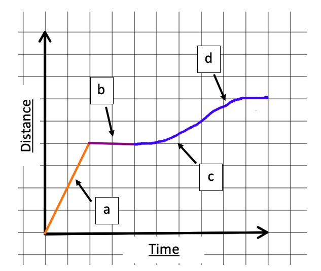Describe the motion in the following distance-time graph at points a, b, c and d.
