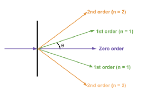 Gives wider maxima with a central white fringe with alternating bright fringes (violet is closest to the central maximum and red furthest)