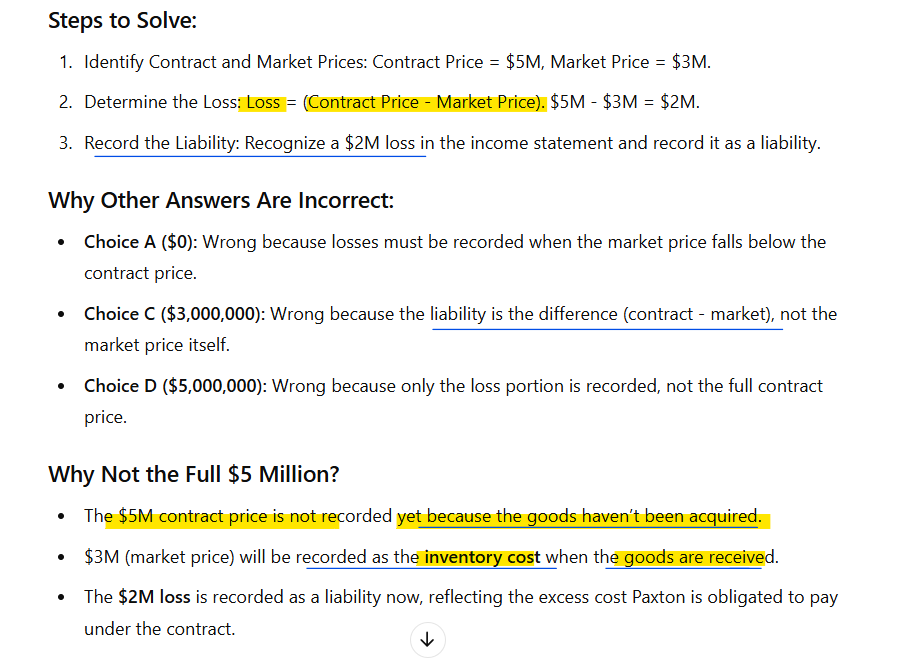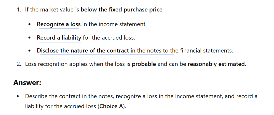 What is the appropriate accounting treatment for a purchase commitment when the market value of inventory drops below the fixed purchase price