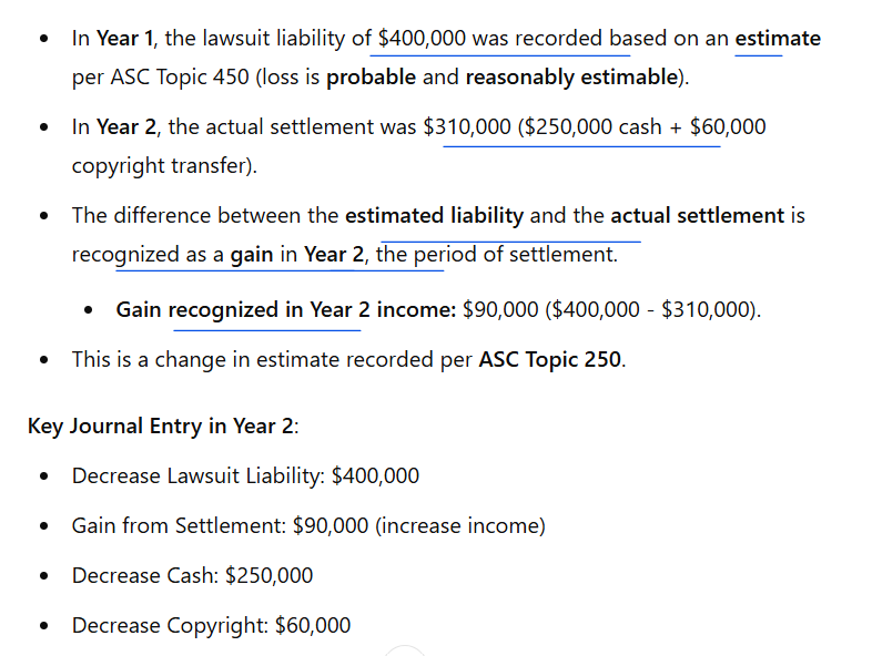 How does the settlement of a lawsuit affect a company’s income if the actual settlement differs from the previously accrued liability