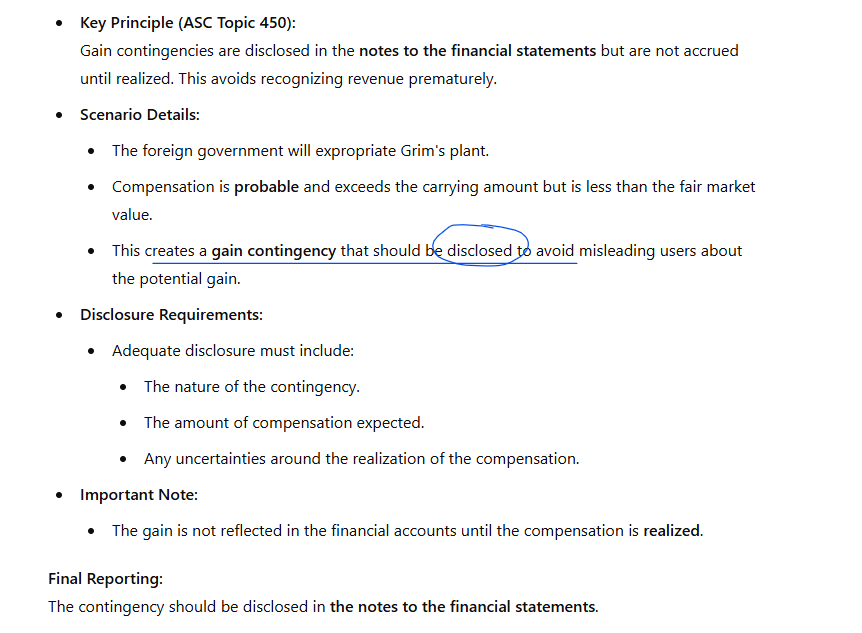 How should a company report a probable gain contingency, such as compensation for expropriated property, when the compensation exceeds the carrying amount but is not yet realized?