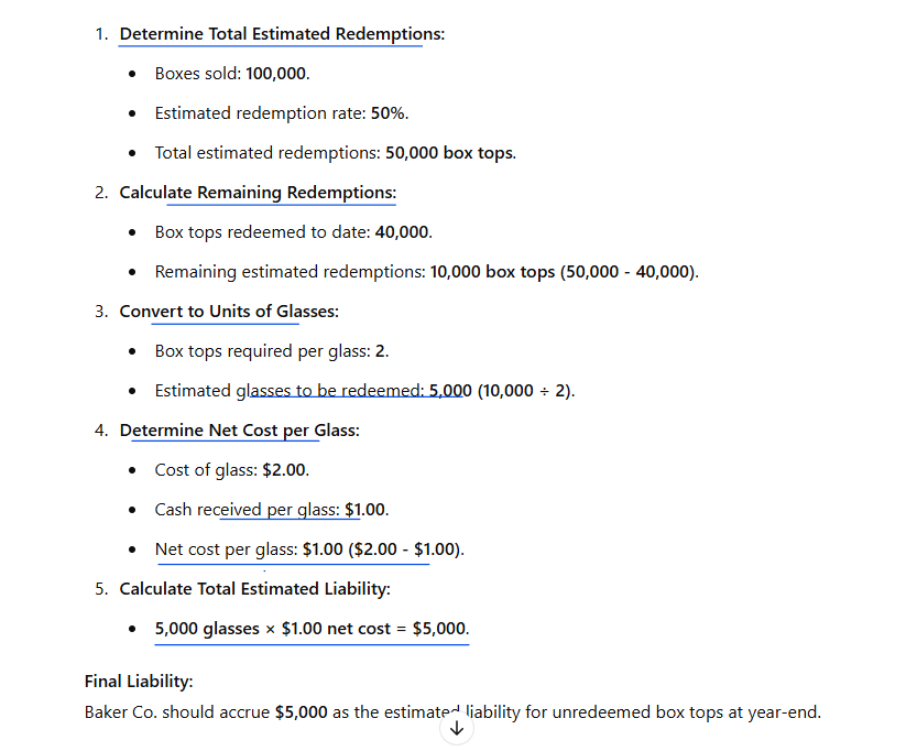 How should a company accrue a liability for promotional items redeemed with box tops and cash?