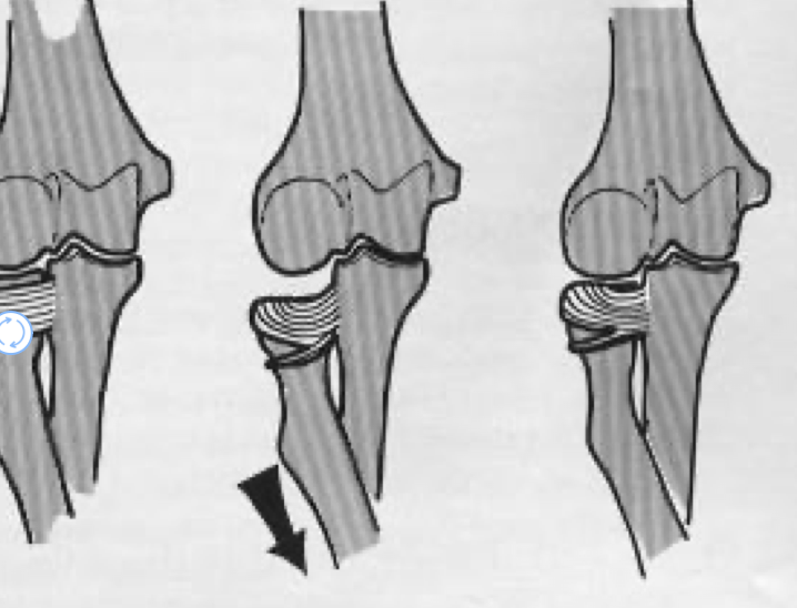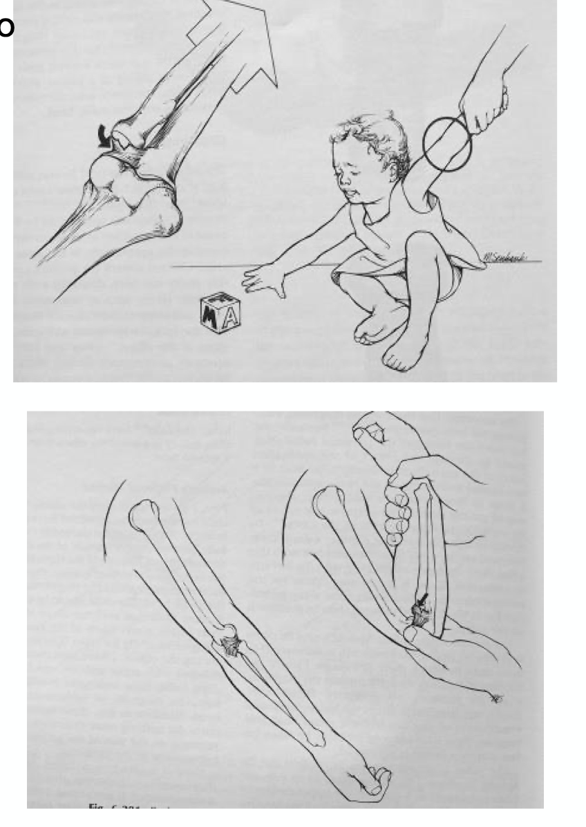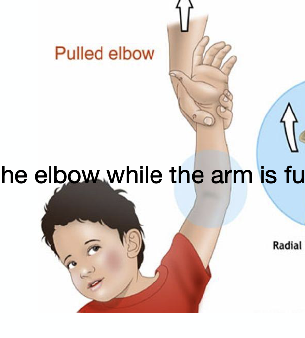 Pulled/nursemaids elbow, caused by a sudden pull/extension of elbow usually in pronation.