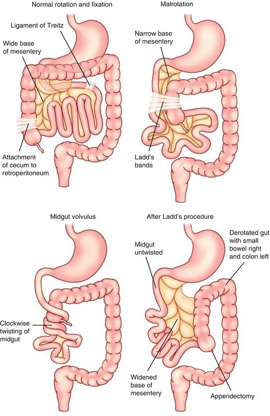 In malrotation, it is attached to the right abdominal wall and crosses over the cecum. (Ladd’s bands)