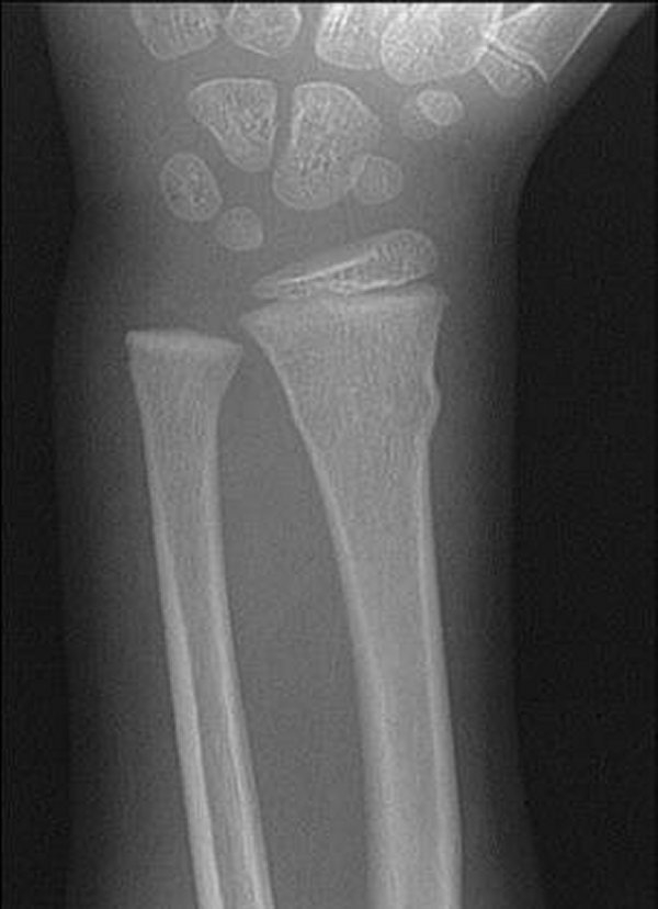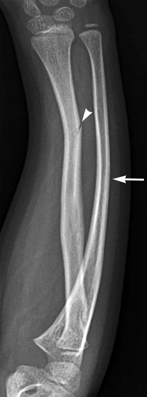 Greenstick fracture of the radius with associated plastic deformation (but not fracture!) of the ulna.