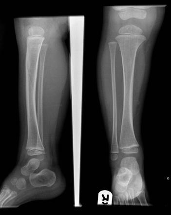 The mechanism/traumatic event is often not witnessed. Radiographs may reveal a non-displaced spiral fracture of the tibia without fibular involvement.