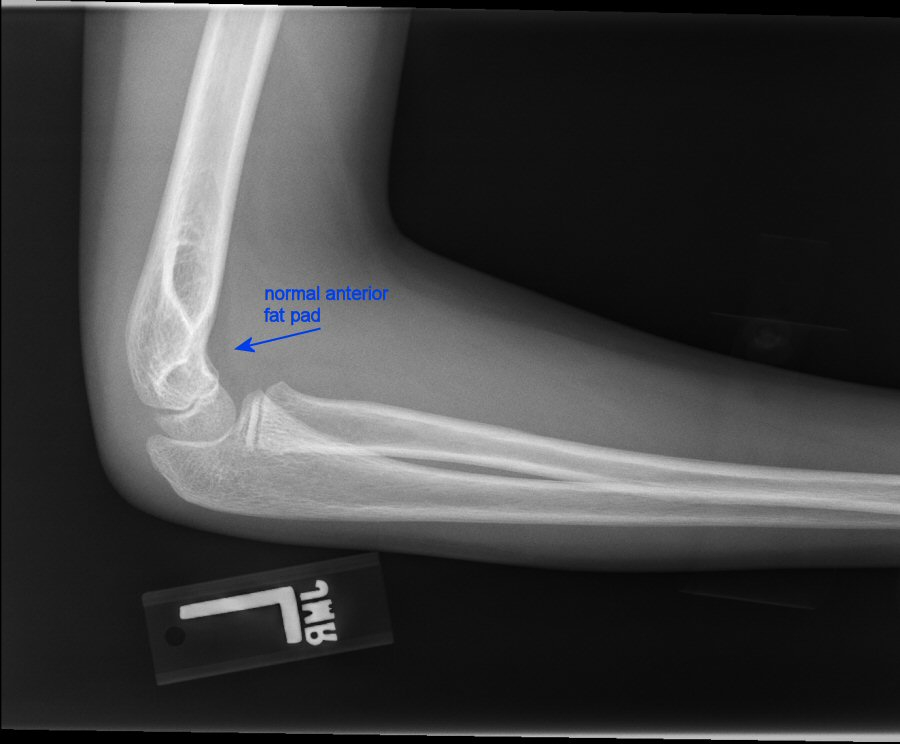 Where should you see a fat pad in a healthy elbow joint?