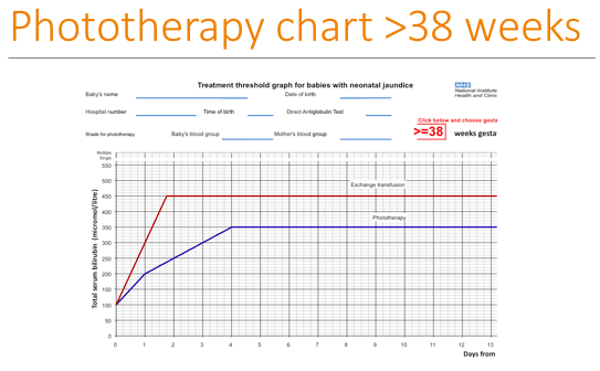 Phototherapy – NICE guideline charts (convers the unconjugated bilirubin to water soluble isomers that can be excreted through the normal pathways)