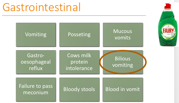 Bilious vomiting is important not to miss as it is bowel obstruction until proven otherwise