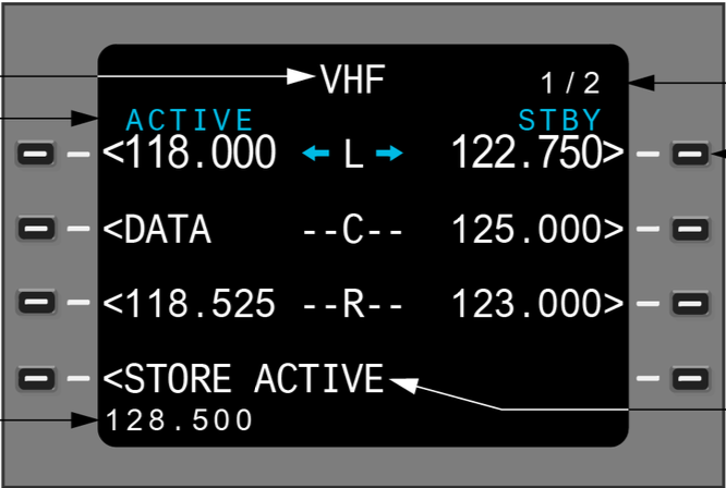 Stored frequencies are accessed from the main VHF page using the standby frequency step control on the TCP.