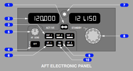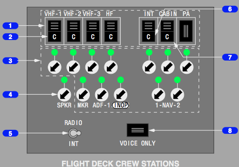 INT (Intercom) – keys oxygen mask or boom microphone for direct transmission over flight interphone and bypasses transmitter selector.