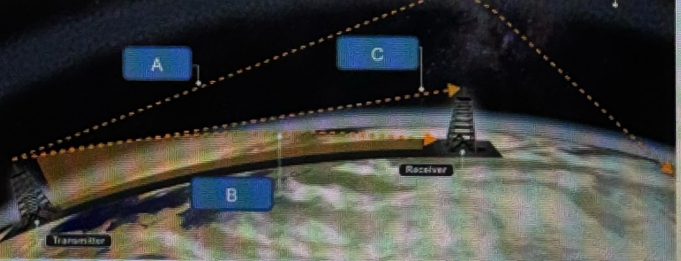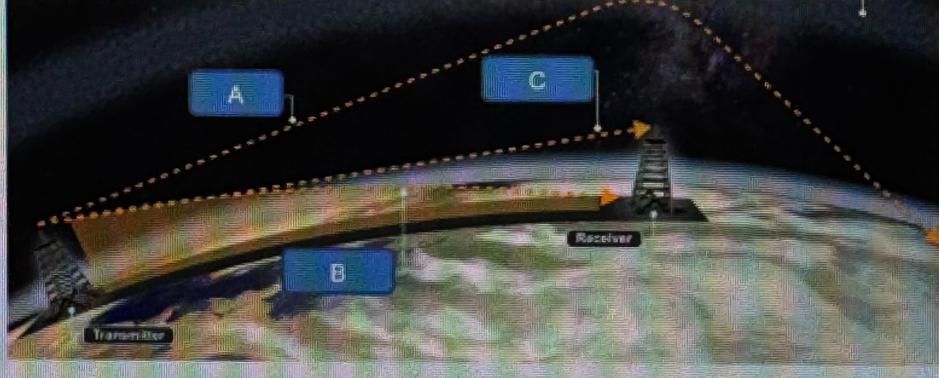 In the graphic below, what is the method of radio propagation depicted at A, B and C?