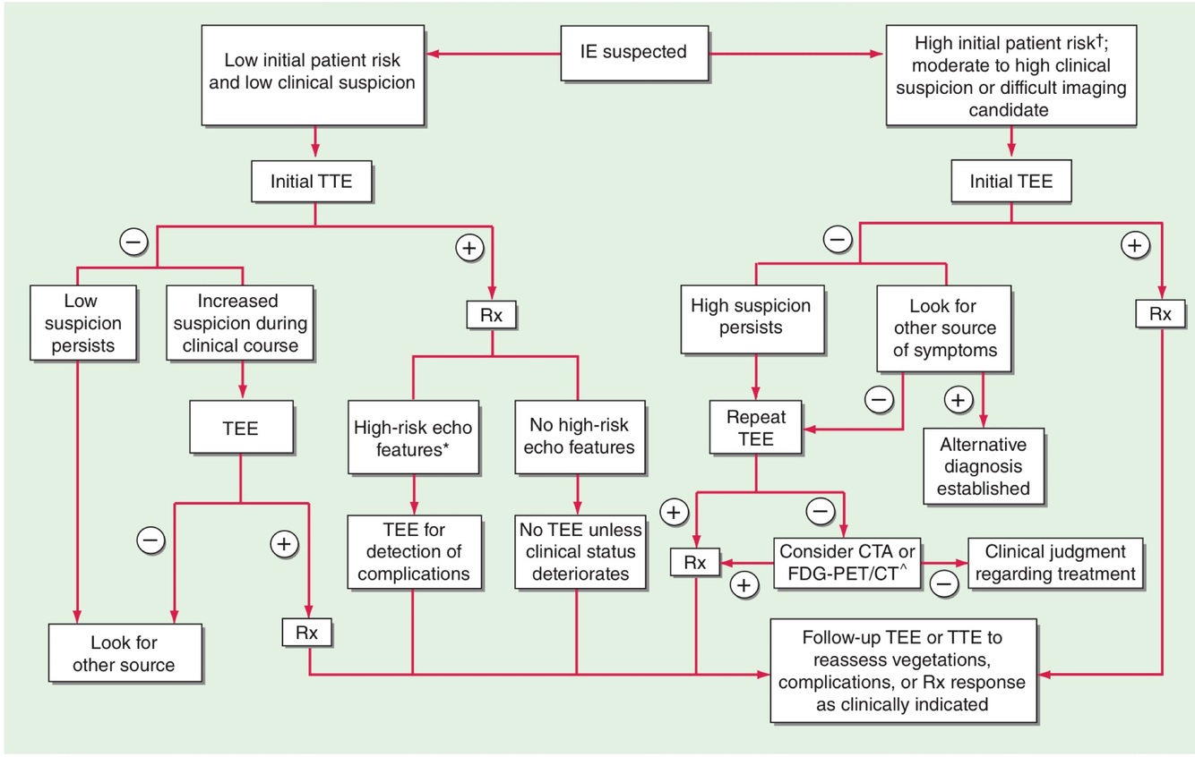 What is the first imaging test for a patient with low clinical suspicion of IE?