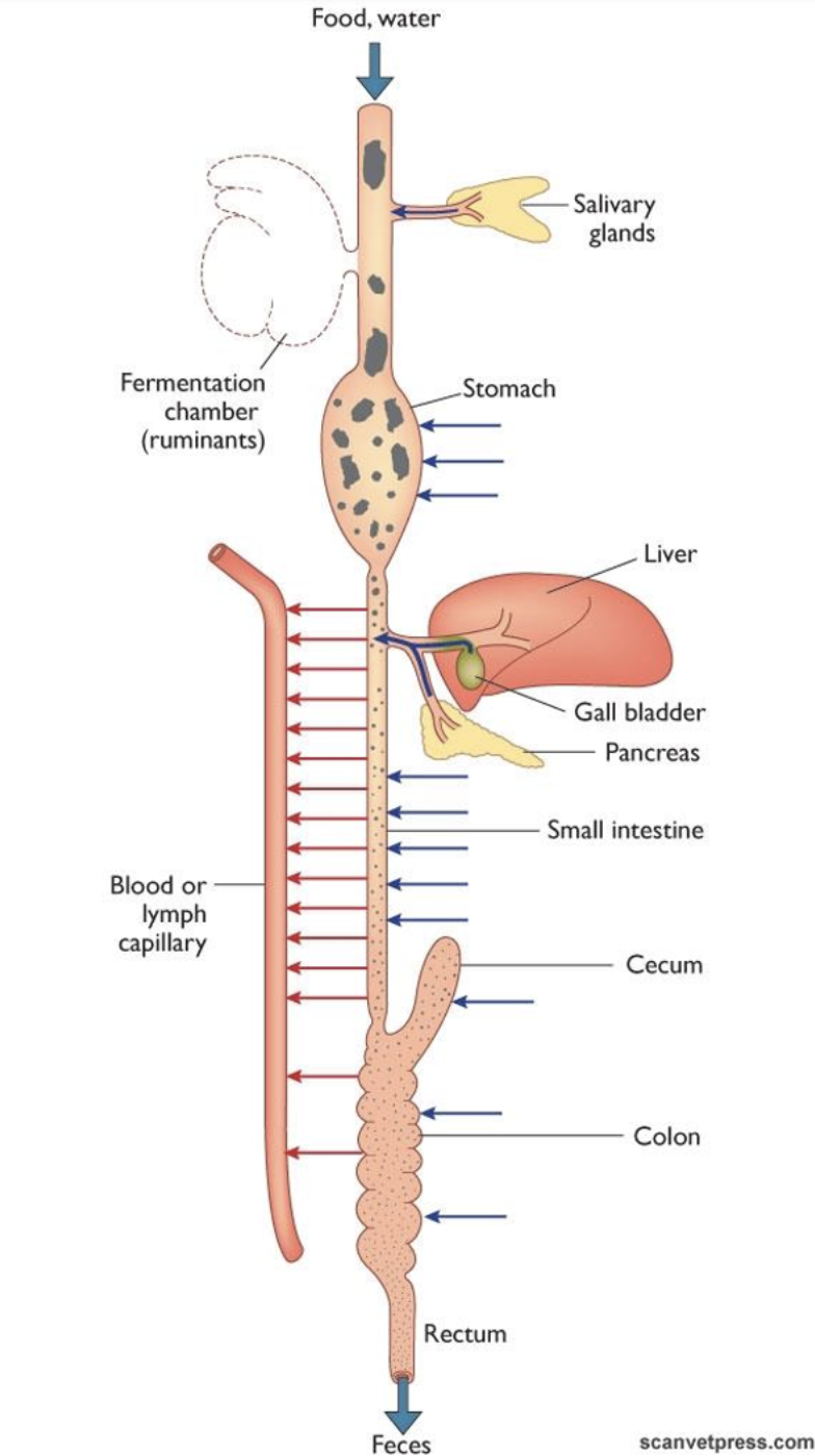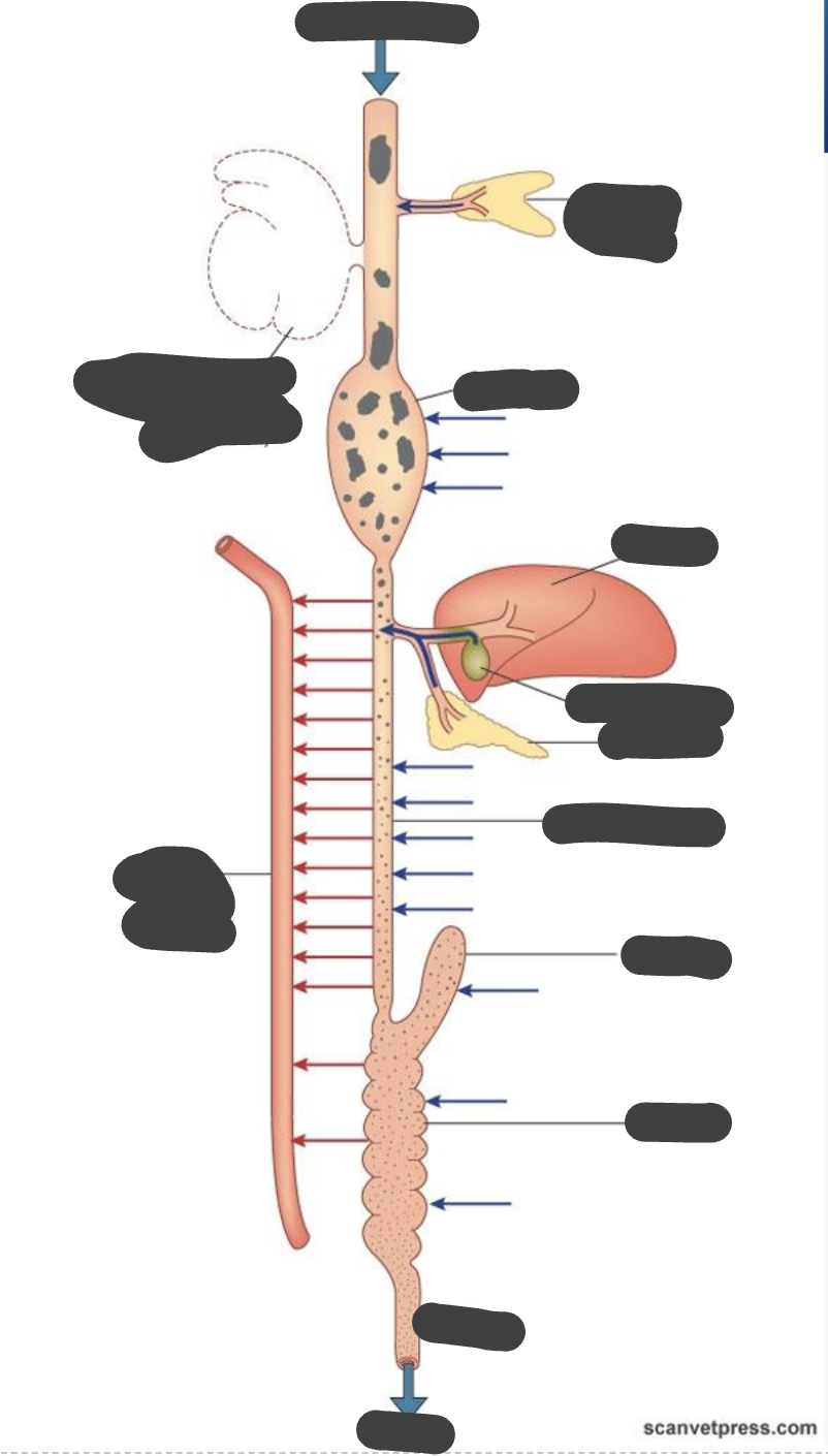Foregut - oesophagus, stomach) - conducts, stores, digests (may ferment)
