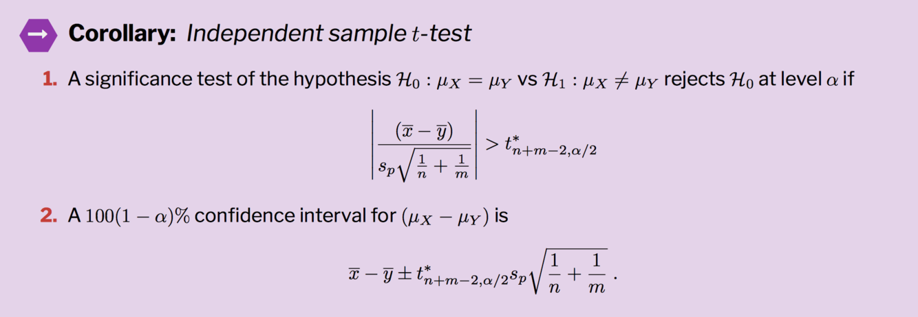 What is the significance test of the hypothesis and confidence interval for the independent sample t-test?