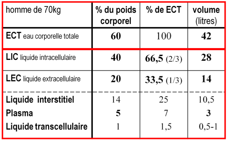 ECT: % du poids corporel, % du ECT, volume (litres)