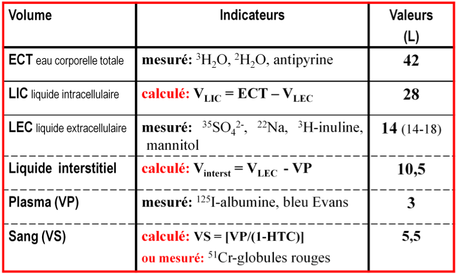 Mesure moins précise (14-18L pour un individus de 70kg) que celles des autres compartiments: résultats différents dépendant de l’indicateur utilisé ==> mesure plutôt l’espace de l’indicateur.